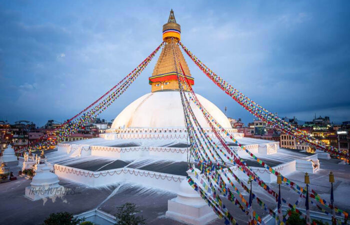 Por la tarde visitaremos la stupa de Boudhanath, aproximadamente 8 kilómetros del centro de Katmandú, es uno de stupas más grande del mundo. La base del stupa es compuesta de tres mandalas sucesivos, las representaciones geométricas del cosmos. La base sí mismo representa la tierra de elemento, el domo sobre la cima de ello simboliza el agua, el cubo representa el fuego, y el finial (un ornamento encima de una aguja) representa el aire. Finalmente, la llama que culmina simboliza el éter. Este gran stupa es mucho como Swayambhunath excepto su finial. También, es mucho más grande y está sobre el piso de valle. Este stupa, como se dice, ha sido construido al Siglo V. El sitio atrae gran números de peregrinos de budistas de todas partes de la región Del Himalaya, y de verdad del mundo. Desayuno incluido